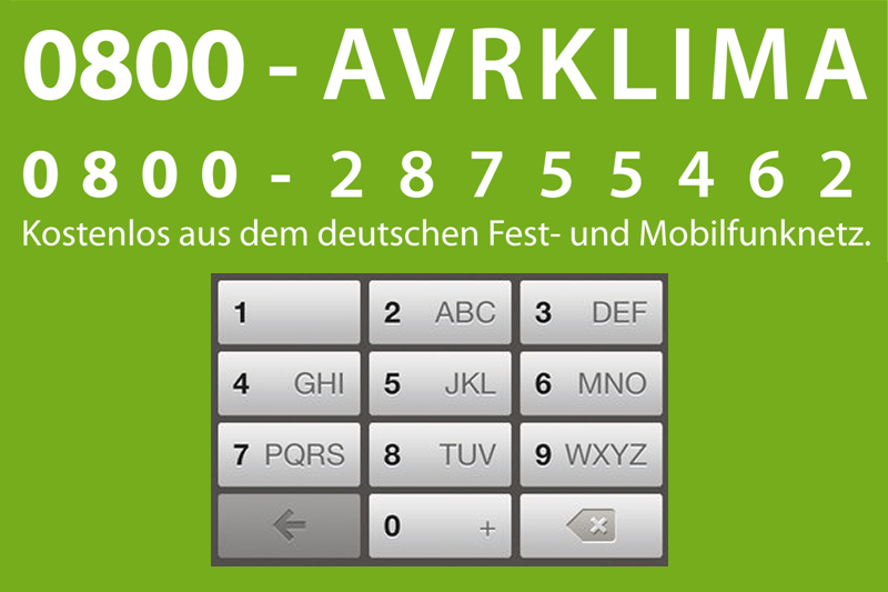 Aufgepasst: Einfach an AVRKLIMA denken, dann die Buchstaben-Kombination AVRKLIMA auf der Telefon -Tastatur eintippen und schon sind Sie bei uns!