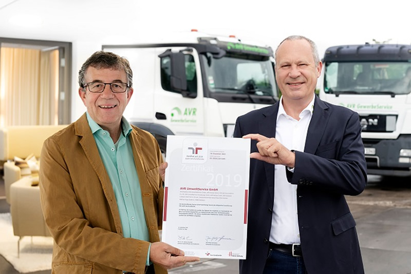 Präsentieren stolz das kürzlich erhaltene Zertifikat Beruf und Familie (v.l.n.r.): Peter Mülbaier, Geschäftsführer AVR UmweltService GmbH und Martin Schmitz, Geschäftsführer AVR GewerbeService GmbH.